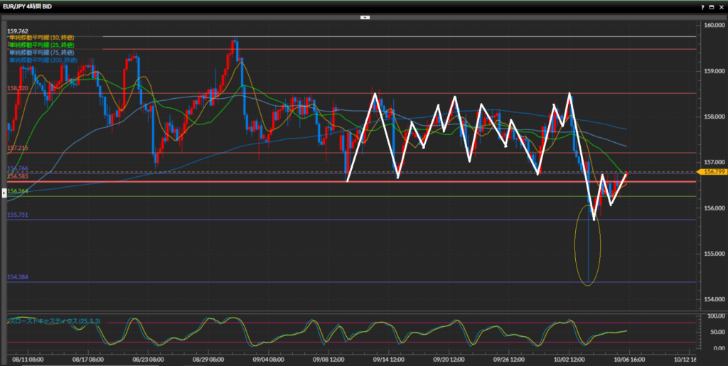 レンジの下値156.58円を下抜け確定したため下目線だが、直近の動きは水平線付近で揉み合ったあと上側まで価格を戻している。
