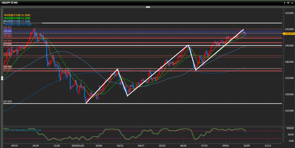 綺麗に高値安値の切り上げの形になっており上目線。150円台に乗った後は147.33円まで急下落。下位足では勢いを失っているものの、日足では上昇の流れは継続と解釈。