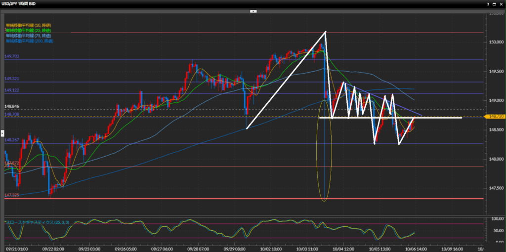 - USD/JPYは日足は上目線、4時間足は下目線、1時間足はレンジと方向感がバラバラ。普段ならレンジの安値148.27円を下抜けした所でショートを狙いたいが、水平線があまり機能していないので今日は仕掛けない。21時半に経済指標の発表あり(失業率、平均時給)。