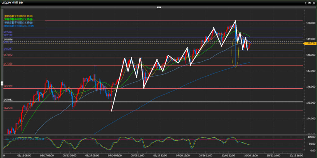 円買いフローの後に下値を支えていた水平線148.71円を下抜け確定し、高値安値切り下げの下降トレンドの形。ローソク足が75SMAをはっきり下抜けている事、10SMAと25SMAがデッドクロス事からも下方向の見方が強めなものの、昨日は直近安値148.27円を更新できていない。