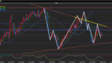 円買いフロー後は下落一服し、足元の上昇は修正波と解釈。ローソク足は日足で引いたトレンドライン付近まで戻ってきており、レジスタンスされたらショート、上抜けたら一旦様子見。