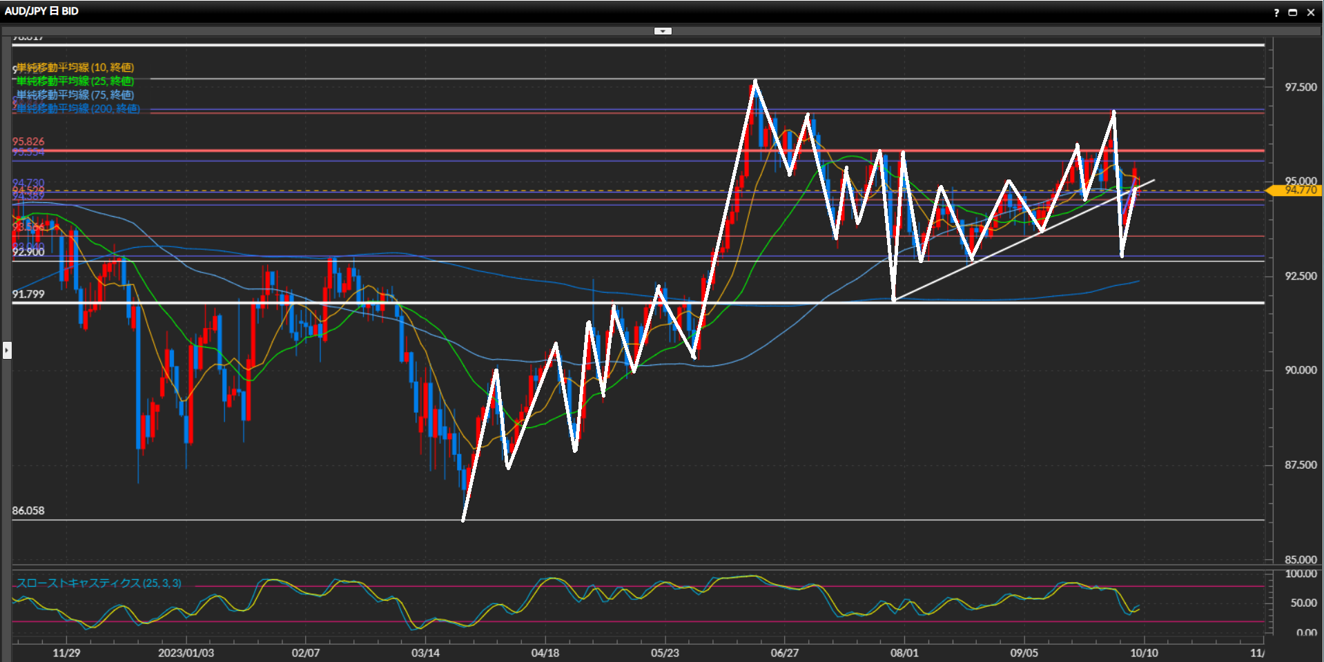 小さな波で安値を更新し目線が切り替わりやすい状態だったが、先週末に日足で引いた上昇トレンドラインの上側まで戻ってきており、上昇の流れを取り戻す可能性も高くなっている。次の高値が直近の高値96.83円を超えられなかった場合に下目線が確定するが、それまで目線は保留。