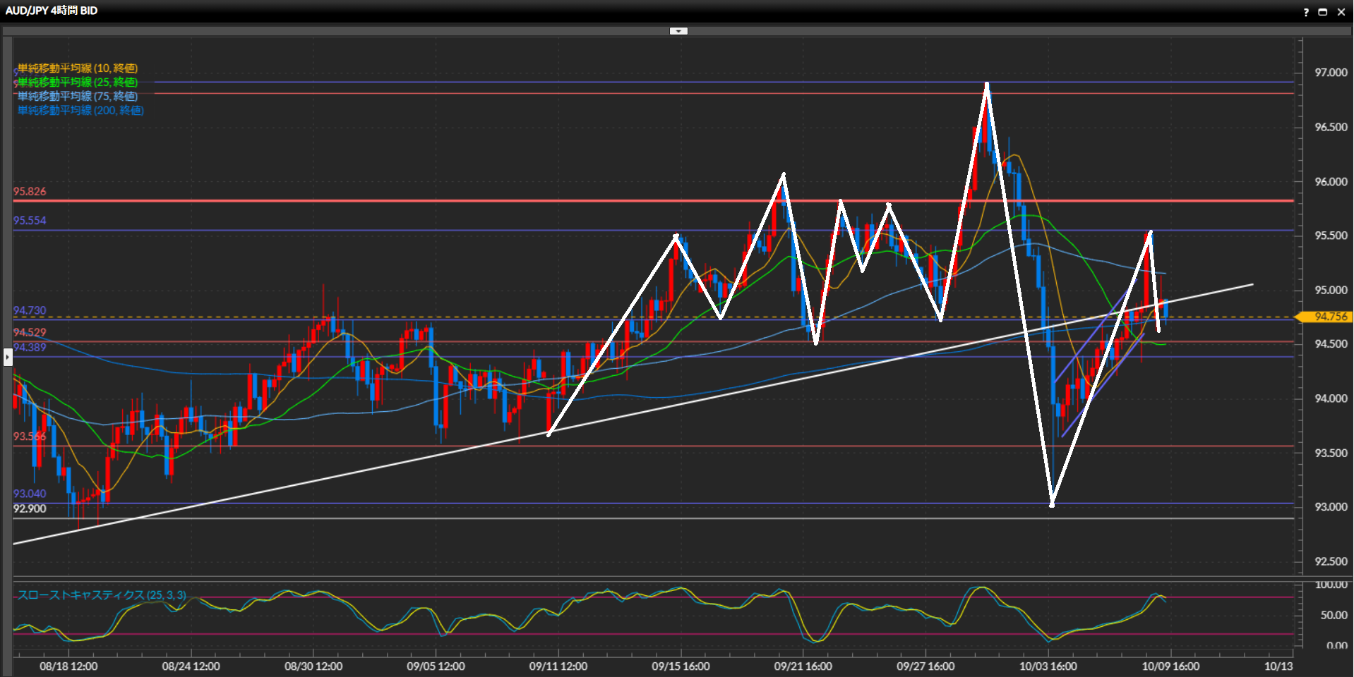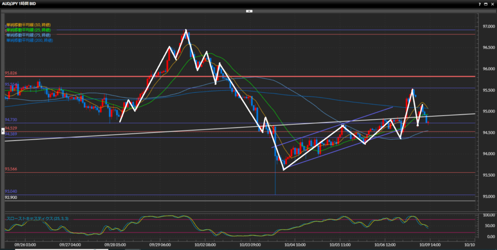 1時間足では高値安値切上げの形は維持しておりダウで見ると上目線。しかし本日朝につけた安値94.62円を下抜け確定した場合は一旦様子見。