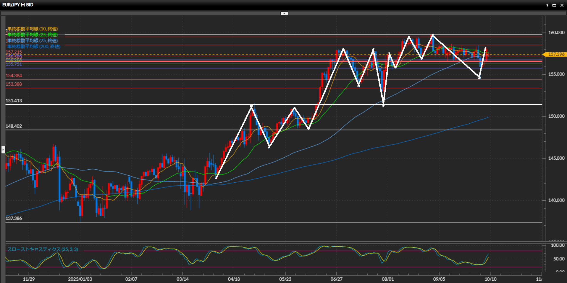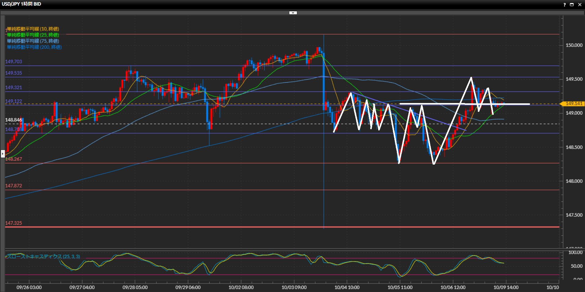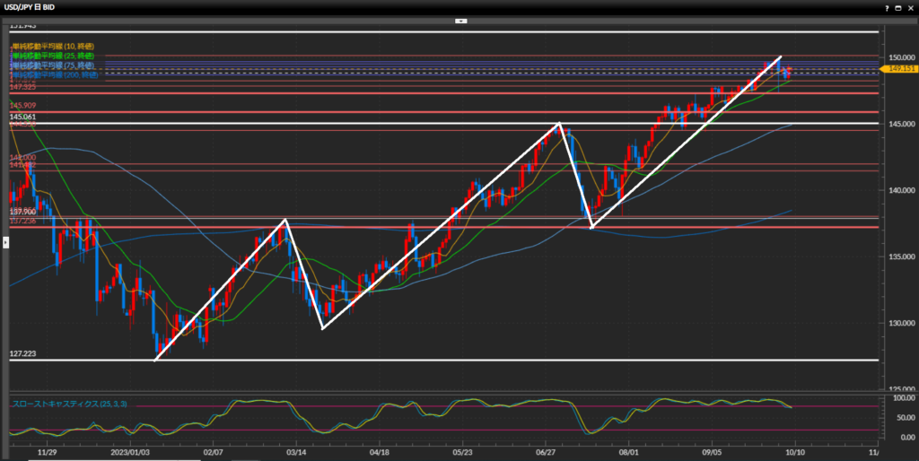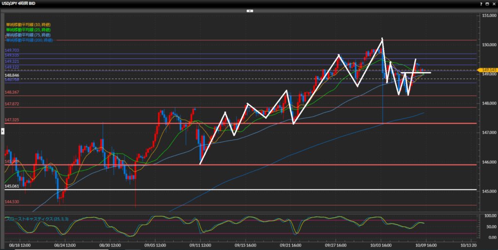綺麗に高値安値の切り上げの形になっており上目線。150円台に乗った後は147.33円まで急下落。下位足では勢いを失っているものの、日足では上昇の流れは継続と解釈。