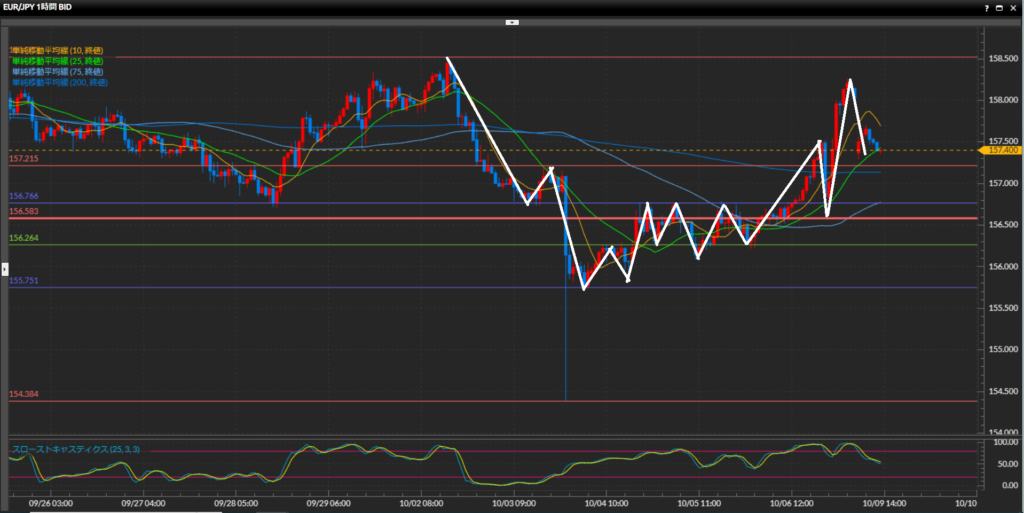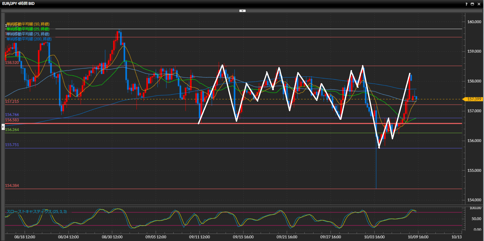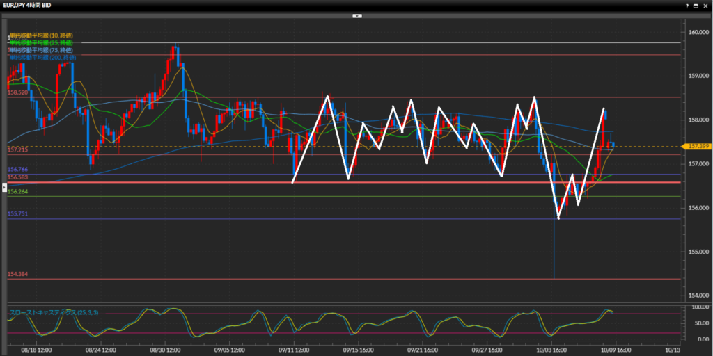 大きな流れでは日足水平線151.41円を抜けない限り上目線だが、先週4時間足水平線156.58円を下抜け確定。下値を試す動きになる可能性が高かったが、先週末にレンジの高値付近まで戻ってきて引けている事から方向感が読みづらい。