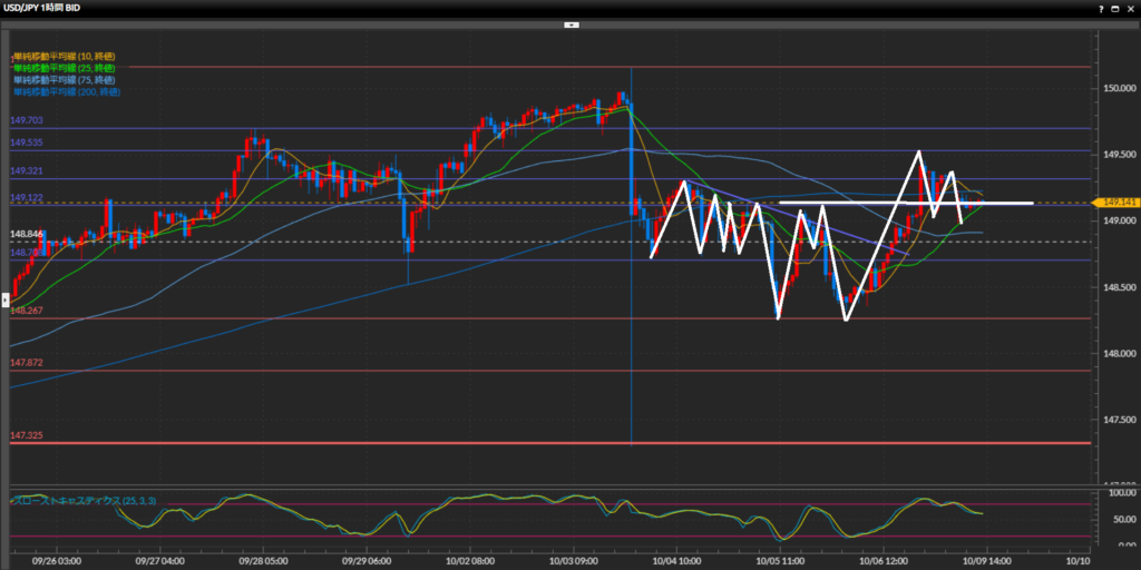 先週末は4時間足水平線148.27円でダブルボトムを形成し、前回高値を突破し引け。週明けは中東情勢悪化によるリスク回避で円高に触れており、1時間足だと高値切り下げの形になっている。一方で25SMAは今の所きっちり意識されているため目線は保留し、高値149.36円を超えたら上目線に戻すイメージ。