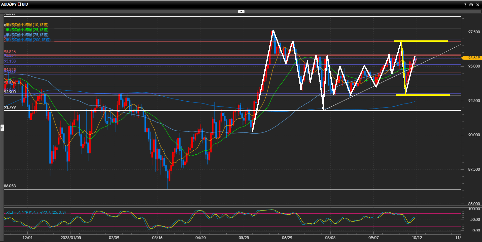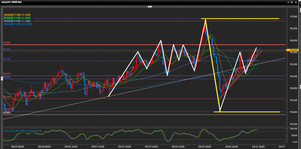 上昇トレンド。先週の大規模円買いフローの一服後からじわじわとした円安が続いているのが特徴。直近高値95.56円を突破したため更に上値を狙いたいが、足元は停滞中。すぐ上に4時間足水平線95.82円も控えている事が警戒感の要因か。