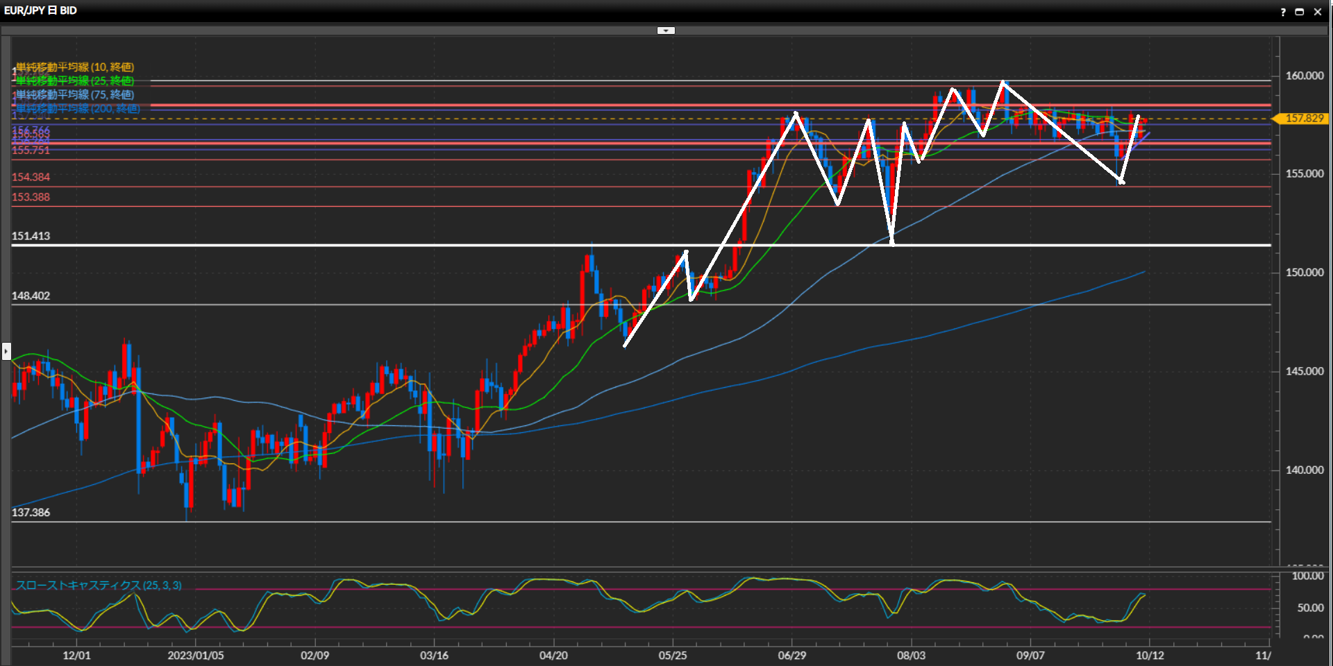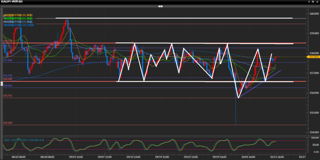 先週の円買いフローでレンジの下値156.58円を下抜け確定したが、水平線がレジサポ転換できずにまたレンジ内へ戻ってきているため方向感のない状況。昨日はレンジ下値でサポートされ、現在は週明けに作った窓の上値が意識されて停滞中。