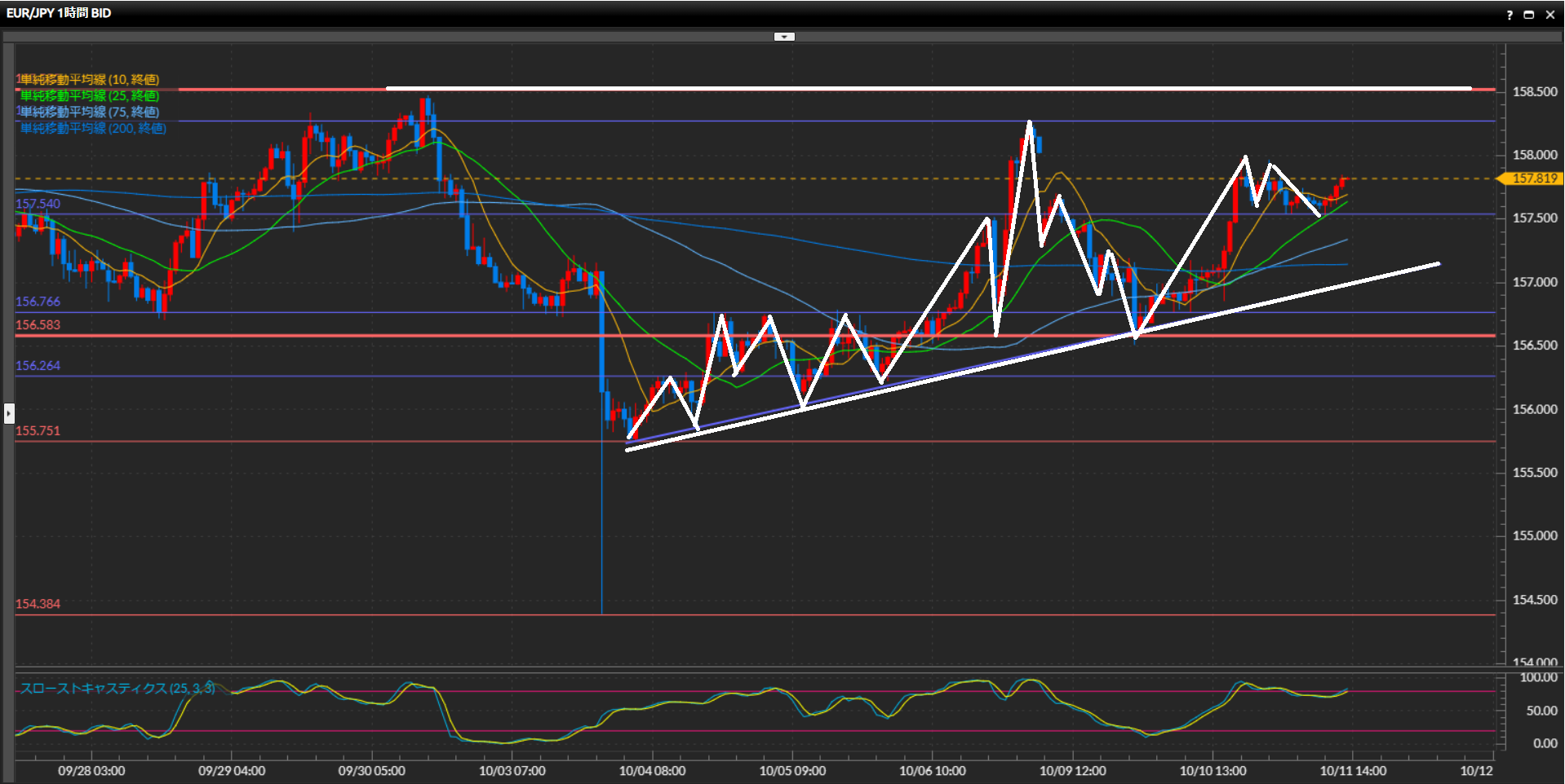- EUR/JPYは相変わらず日足、4時間足で方向感のない相場が続いている。1時間足は大きな流れでは上昇が続いており、現在は週明けに形成した窓の高値が意識されている。