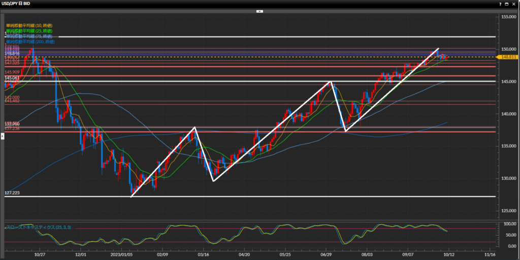 綺麗に高値安値の切り上げの形になっており上目線。150円台に乗った後は147.33円まで急下落。下位足では勢いを失っているものの、日足では上昇の流れは継続と解釈。