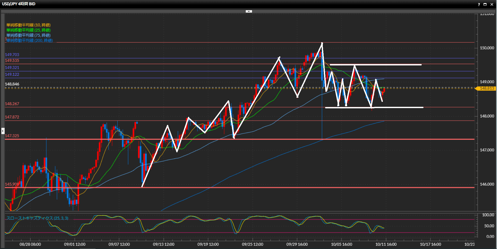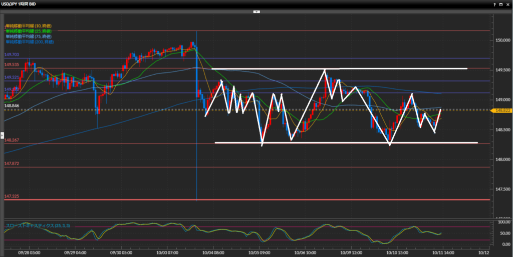 先週の米国雇用統計前後で形成した148.27円-149.54円の間を上下しており、方向感を失っている。