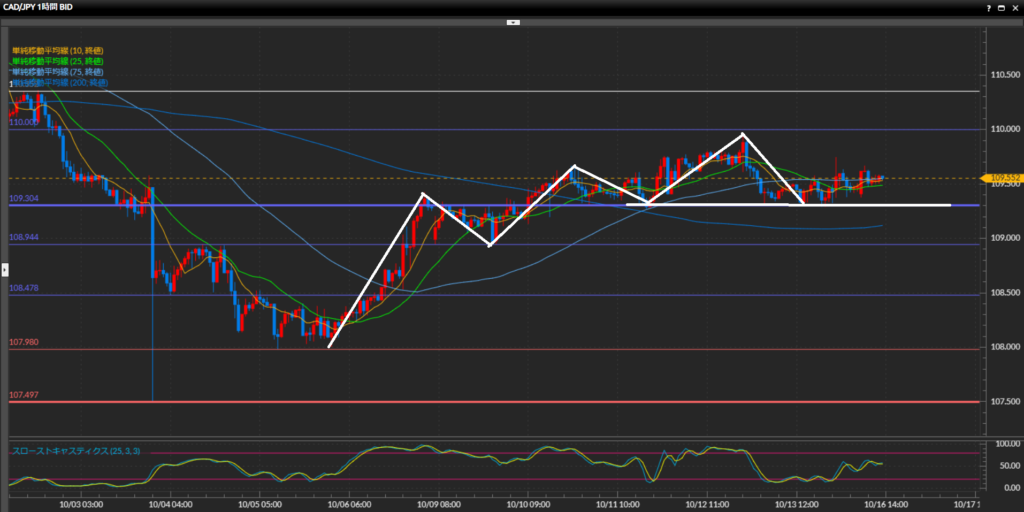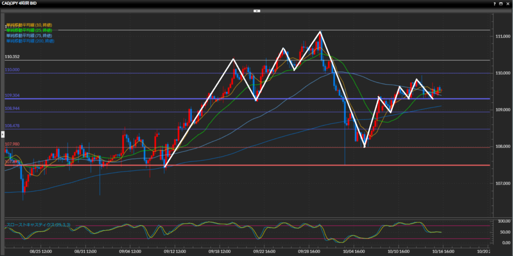• CAD/JPYは日足〜4時間足で見ると上目線が続いているが、1時間足では110.00円手前で停滞が続いている。109.30円付近で下値を支えられており、抜けたら目線転換。