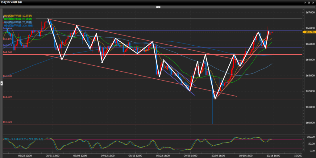• CHF/JPYは短期的には上昇が強い。先週末に4時間足の上昇トレンドラインを一度下抜けたものの、164.78円の水平線でサポートされ上昇の勢いを取り戻し、夜間に166円台に触れている。