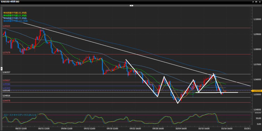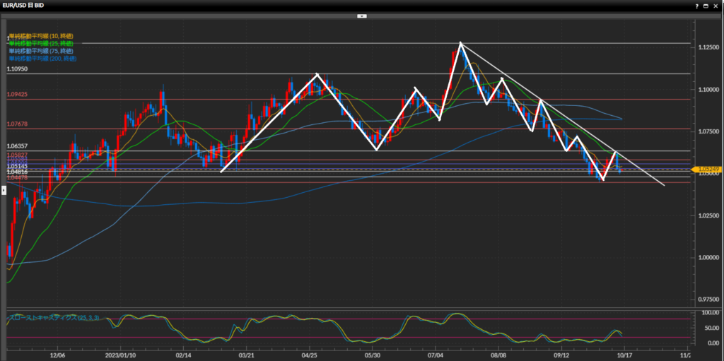 7月下旬以降下降トレンドが継続しており、下目線。下値目標である日足水平線1.0482ドルを下抜け確定したが、下降トレンドライン手前まで一度戻している。
