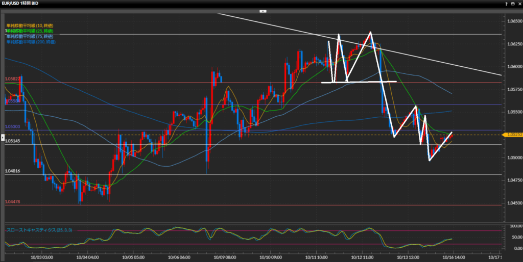 • EUR/USD日足〜1時間足で下目線が揃っている状況。1時間足レベルで戻りが若干強めなものの、直近の高値を切り上げない限りは戻り目からショートで狙うのが基本。