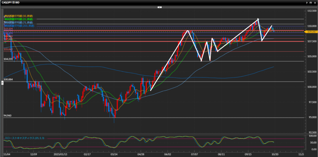 下値を支えていた水平線109.30円がブレイクし上目線が終了。75SMAも下抜け確定しており、下降の勢いが強い。このまま高値を切り下げれば下目線に固定。