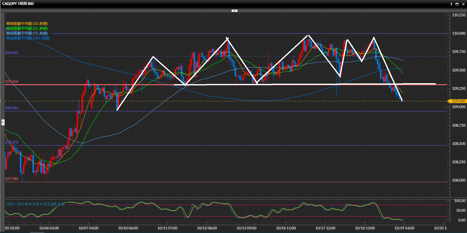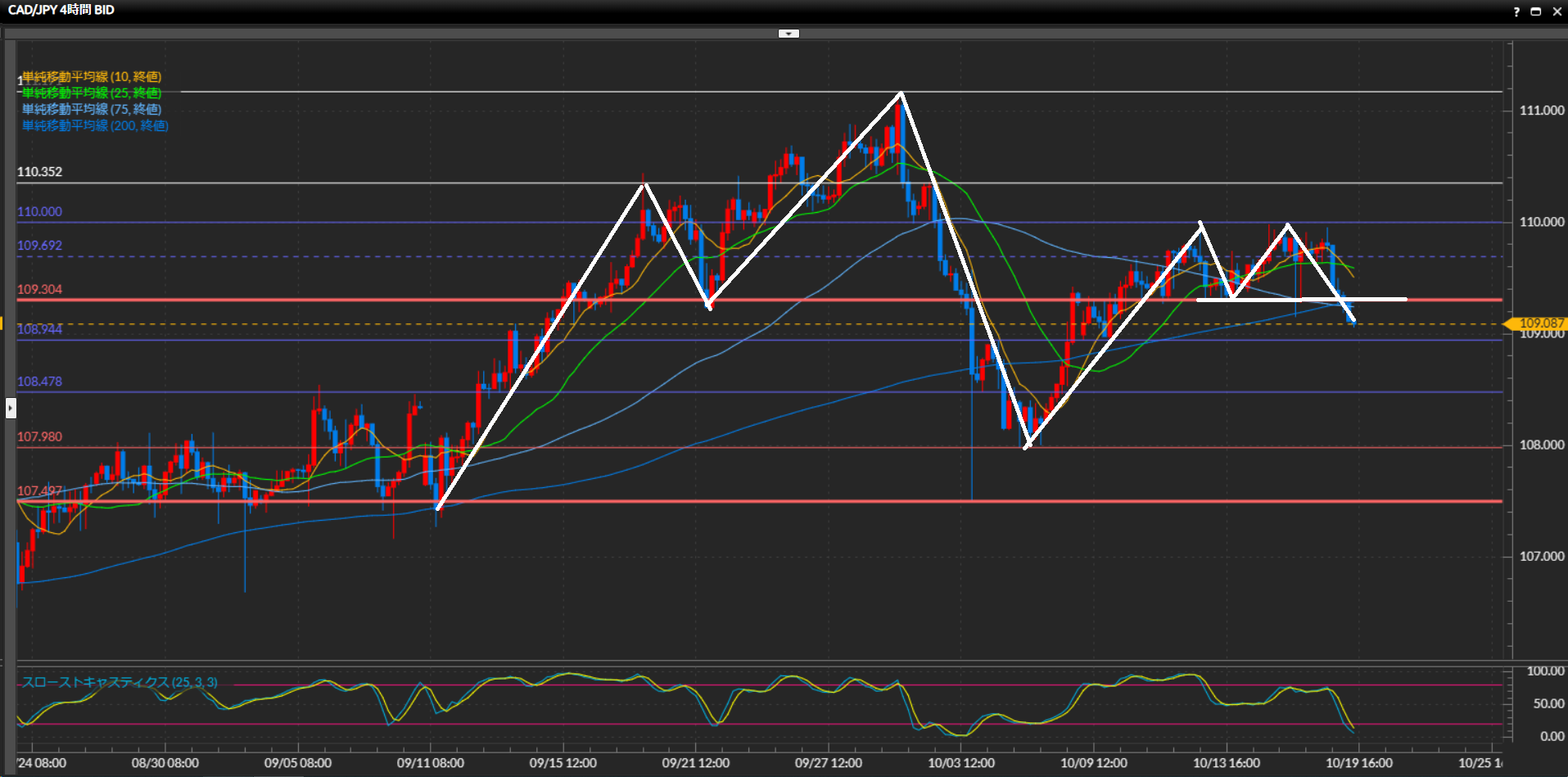 • 加ドル円は下値を支えていた109.30円がブレイクした事で、4時間足以下で上目線が終了。下落の勢いが強く、高値切り下げの形を作れば下目線で固定。