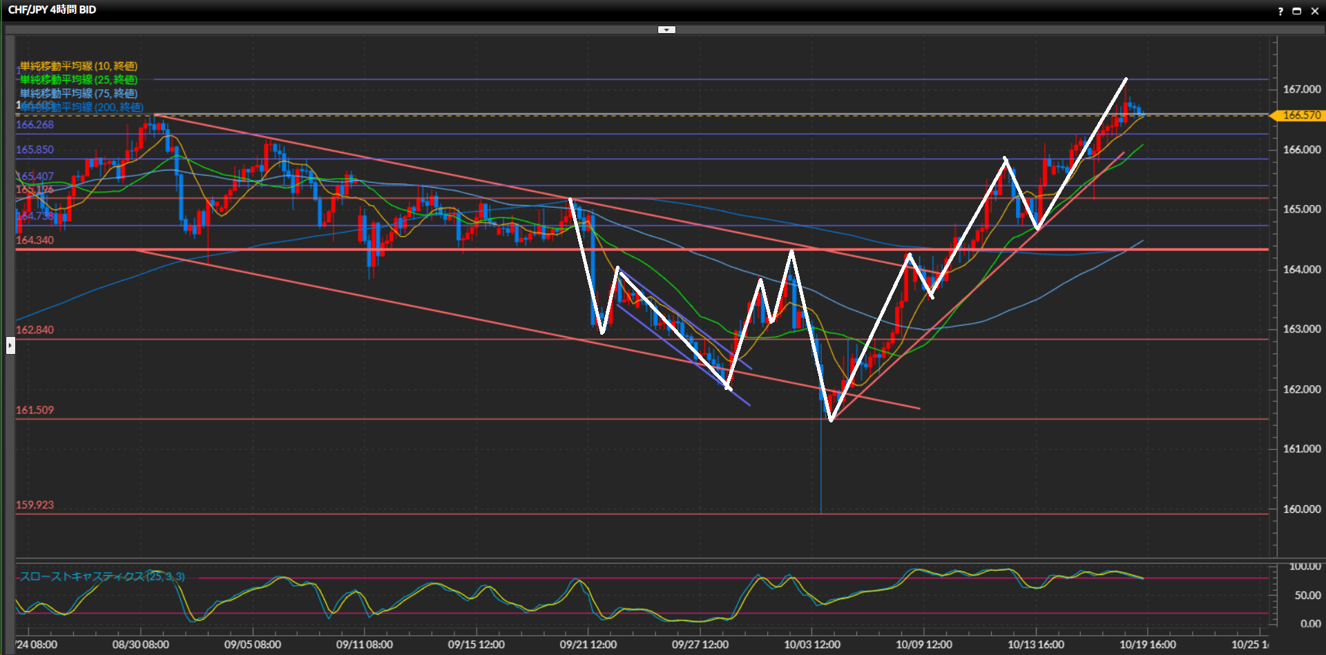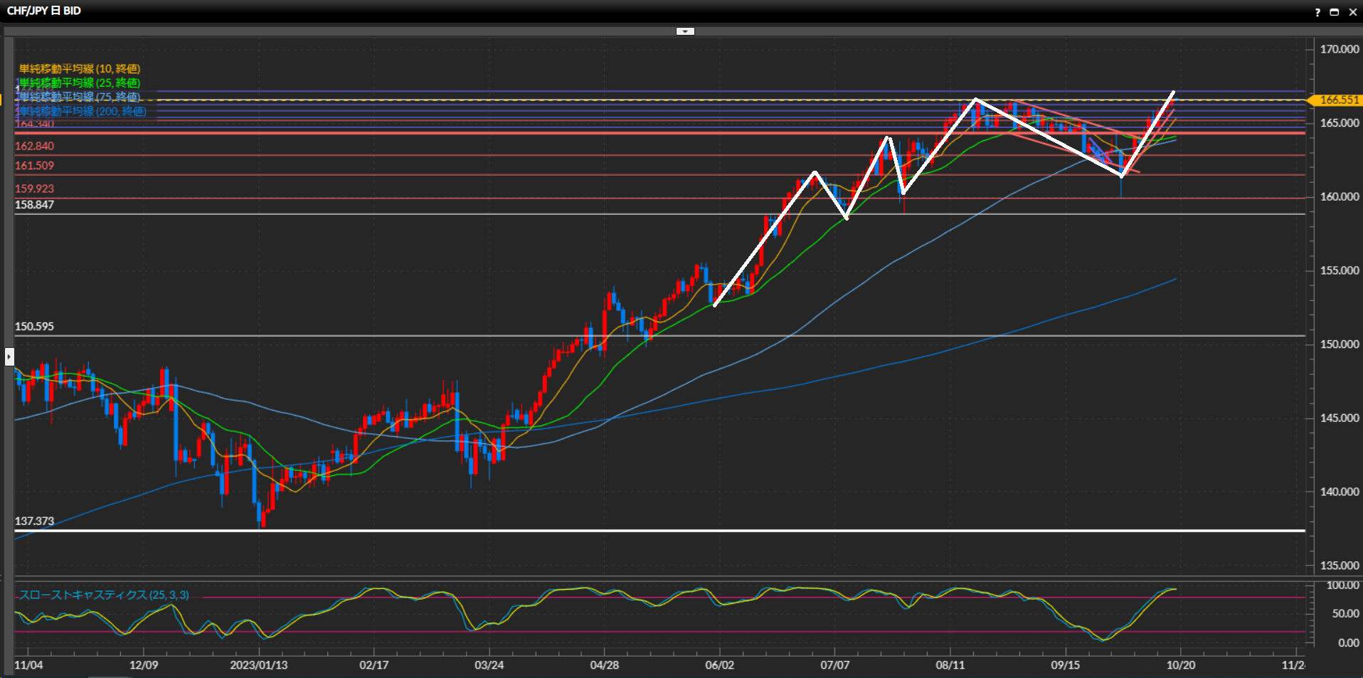 上昇トレンド。日足の最高値166.60円を上抜け確定。中東情勢の緊迫化を受けてクロス円が円買いに傾いている一方で、安全資産とされるスイスフランは他とは逆向きの動きをしている。