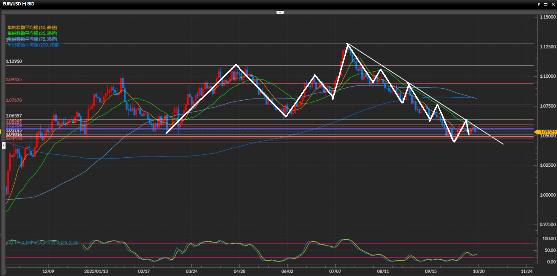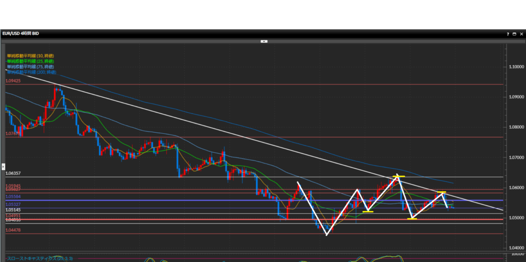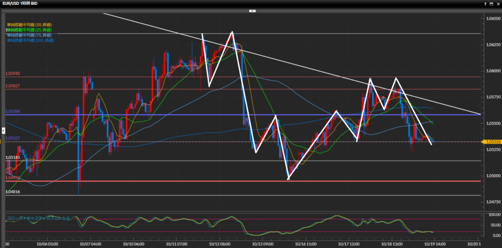 小さな波で高値安値を切り下げているため、ダウ分析では下目線として捉える。しかし下降の勢いは弱くSMAも傾きがまちまち。日足、4時間足で意識されそうな水平線が下に数本通っており、このまま下落が続く可能性は微妙な所。一旦は直近安値1.0495ドルを抜けられるか注目。