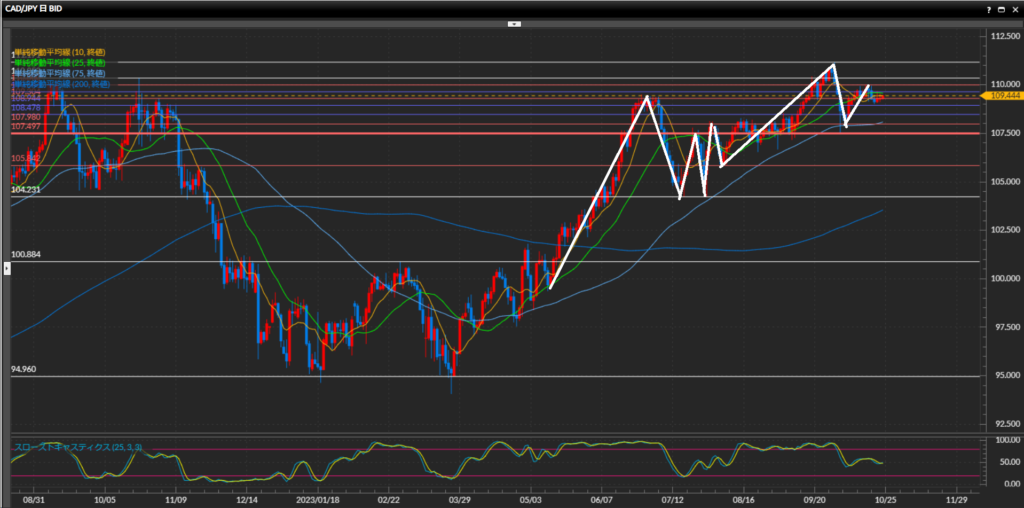 ダウでは上昇トレンド継続。しかし10SMAと25SMAは横ばいになっており上昇の勢いを失っている。目線を分ける水平線は波の下値で引いた104.23円。
