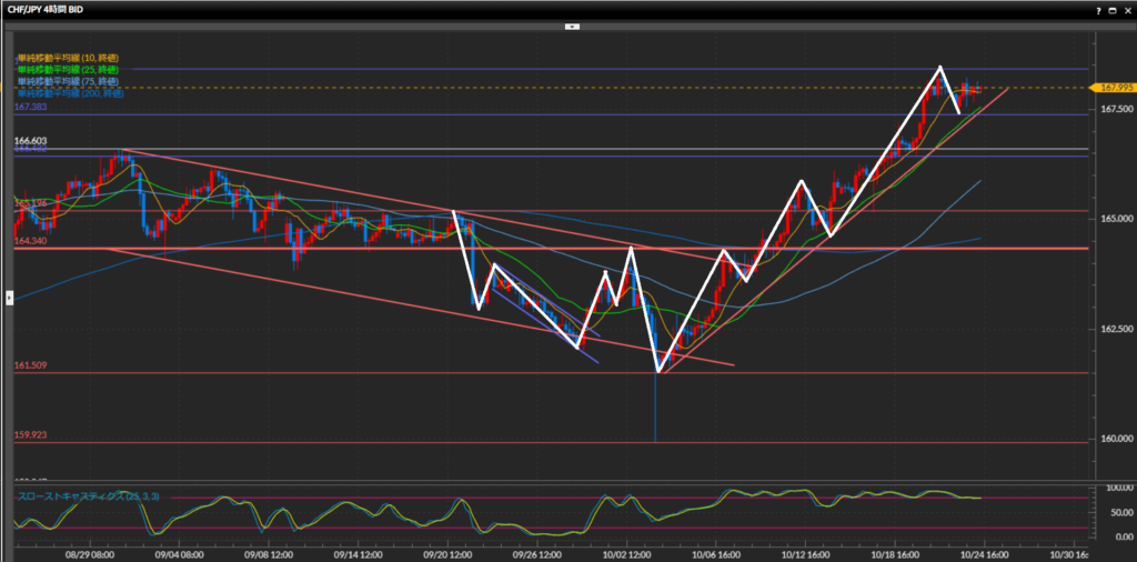 上昇トレンド。168.42円まで最高値を更新した後は167.38円まで戻されて停滞中。上昇トレンドラインや25SMAでサポートされて今の勢いのまま高値更新するのか、ブレイクしてより大きな修正が入るのか注目。