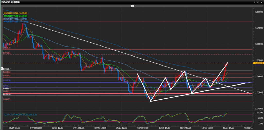 - ユーロドルは日足の下降トレンドラインをブレイクし、上昇トレンドに転換。一旦の目標は4時間足水平線1.0768ドルや、その手前1.0735ドルまでロング。
