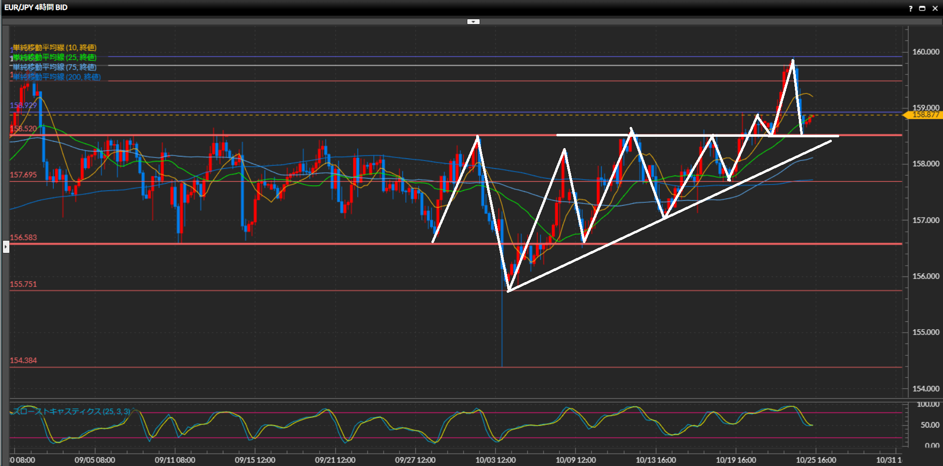 上昇トレンドだが、167.38円-168.42円の間で揉み合いが続いている。上昇トレンドラインや75SMAでサポートされるかどうかがトレンド継続のポイント。