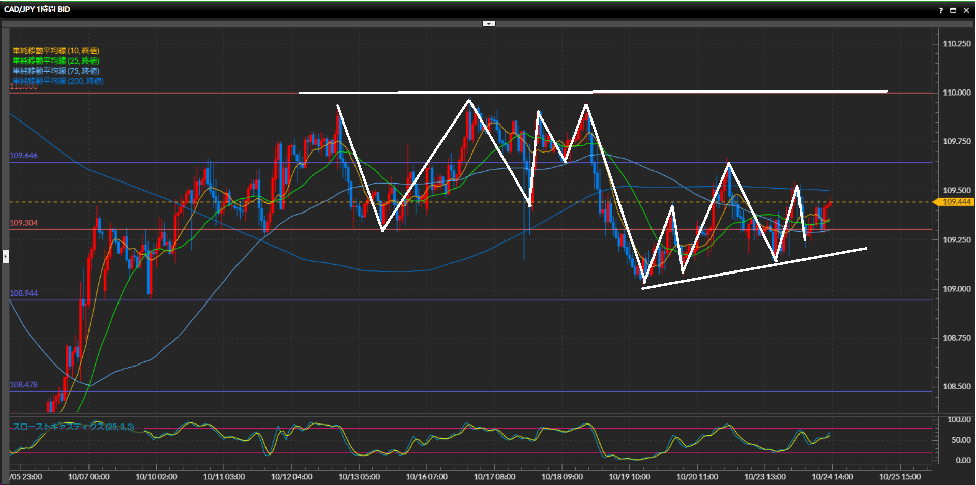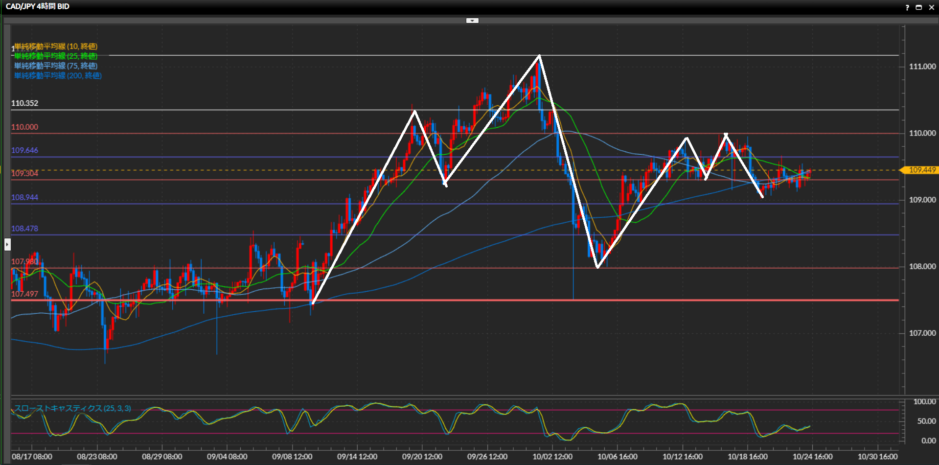 - 加ドル円は昨日と状況変わらず、日足レベルでは上目線が継続しているものの、4時間足以下では目線を分ける水平線109.30円を下抜け後に停滞に入っているため、ポジションを持つには方向感が曖昧なので一旦様子見が無難。