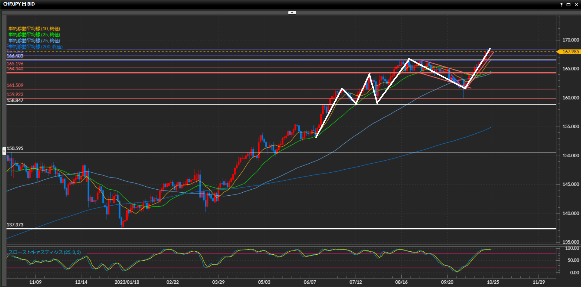- フラン円は日足〜1時間足で上昇トレンド。最高値168.42円をつけた後、昨日〜現在までは修正局面。現在の上昇は中東情勢不安に起因するためヘッドラインに引き続き注目。1970年以降で最高値を更新中のため、直近高値以外に上値を抑えそうな水平線がない状態。