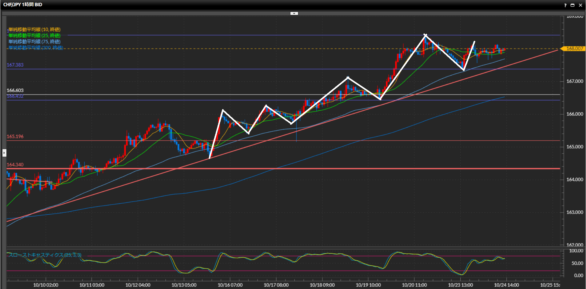 上昇トレンドだが、167.38円-168.42円の間で揉み合いが続いている。上昇トレンドラインや75SMAでサポートされるかどうかがトレンド継続のポイント。