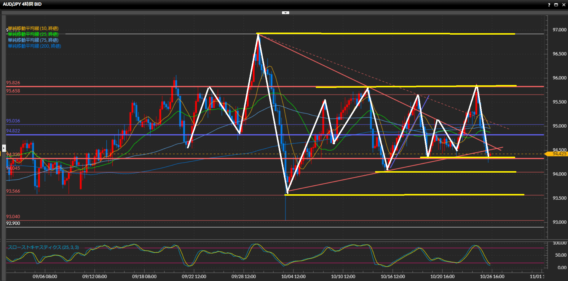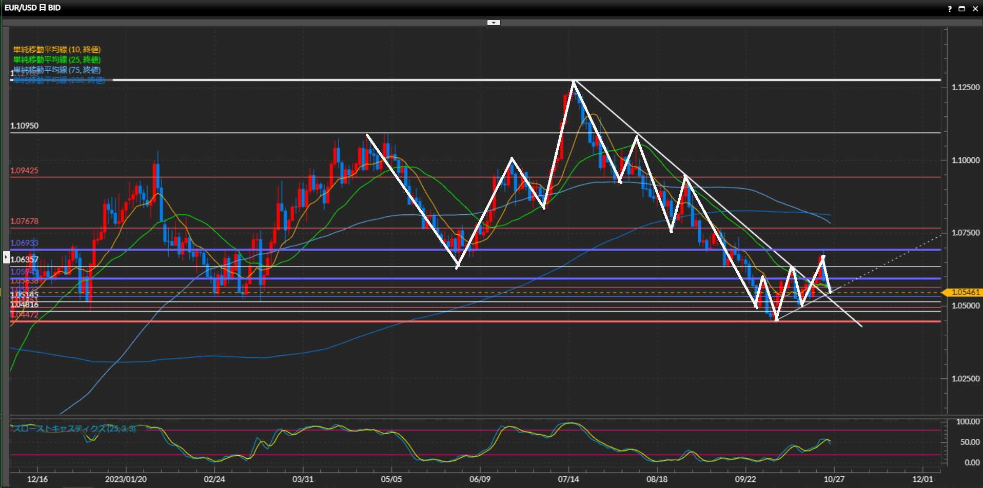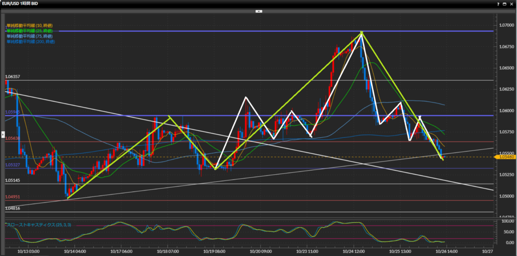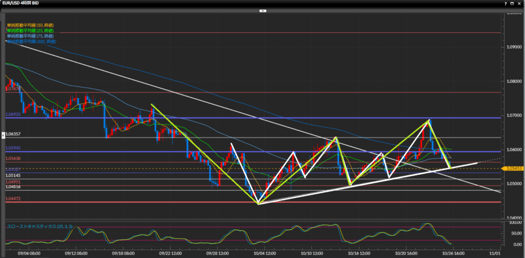 - ユーロドルは日足〜4時間足で上目線継続と捉えつつ、1時間足は下目線。上昇トレンドラインでサポートされて再び上昇するか、ブレイクして再び日足レベルの下降になるのか注目。