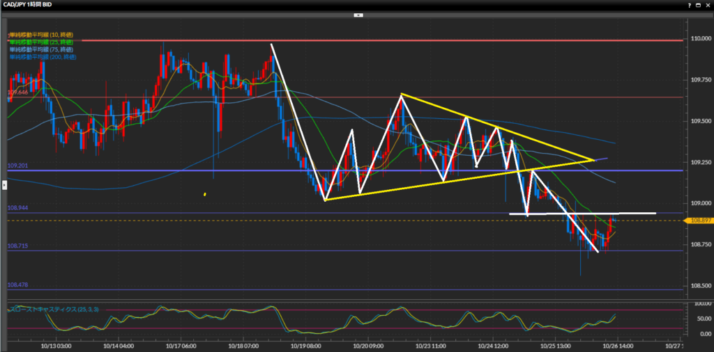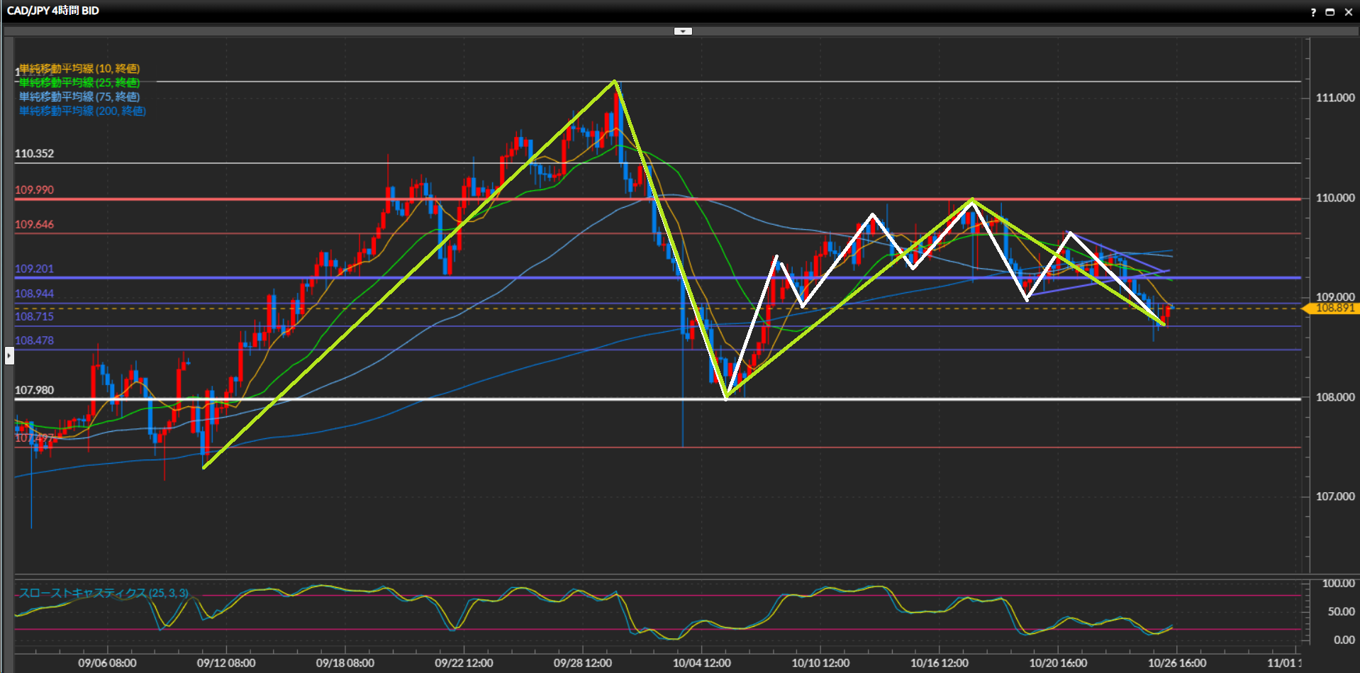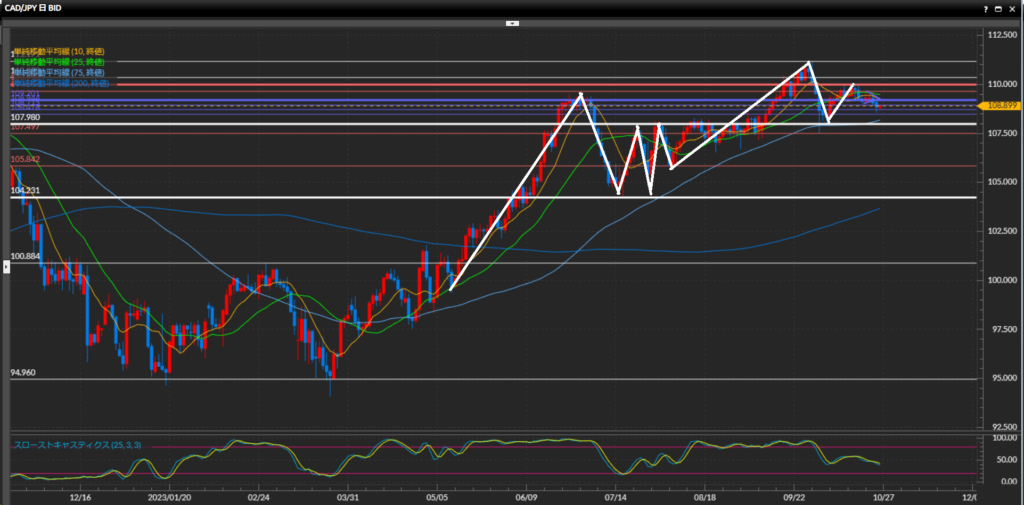 - 加ドル円は4時間足、1時間足が下目線で、下落の動きが強い。日足の目線転換線107.98円までが一旦の下値目標。