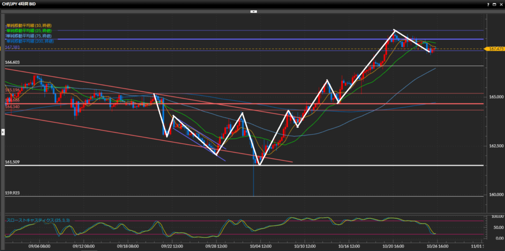 下目線。下降の流れは緩やかで、現時点では上位足の上昇トレンドに対する修正波と捉える。直近波の高値は167.97円で、ここを抜けたら再びロング狙い、抜けない限りは短期的にショートを狙う。