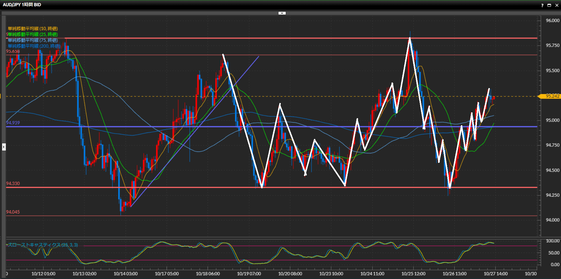 - フラン円は日足〜4時間足で上目線に対し、1時間足は緩やかに下降中。1時間足が再び上目線に切り替わったらロングを基本スタンスとして、短期的にはショートも狙う。中東情勢によって波の上下や方向に敏感に反応すると思われるため、引き続きヘッドラインに注意。