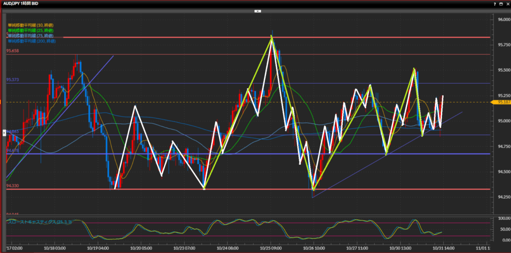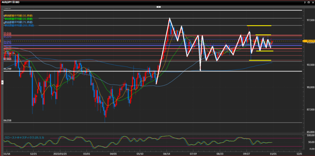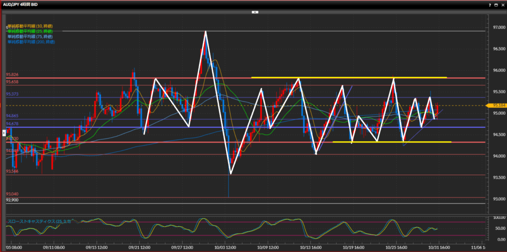 - 豪ドル円は日足では上目線継続、4時間足はレンジ、1時間足では上昇トレンド。比較的波の形がはっきりしていて、ダウの基本通りに狙いやすい。レンジの中のトレンド方向に沿って仕掛けていく。