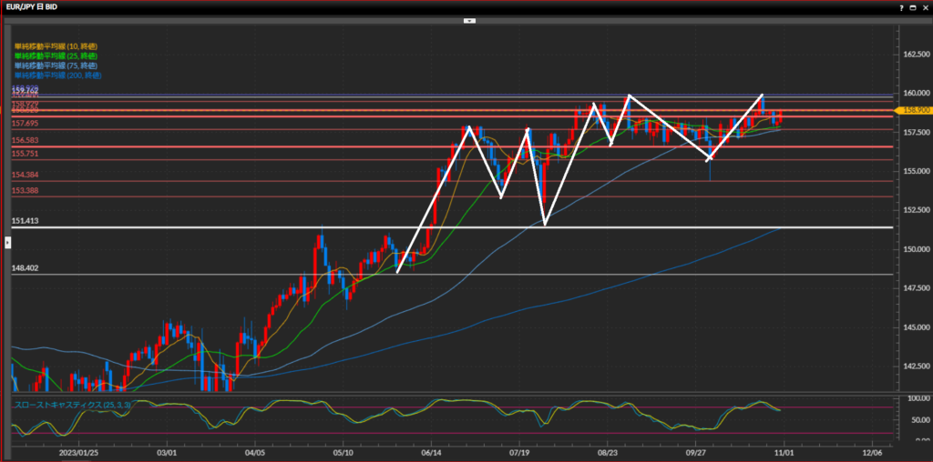 上目線。10月初にレンジの下値で引いた水平線156.58円を下抜け確定したものの、現在はここが押し目となり高値を目指している。最高値159.76円の上抜けチャレンジ中。目線を分ける水平線は151.41円。