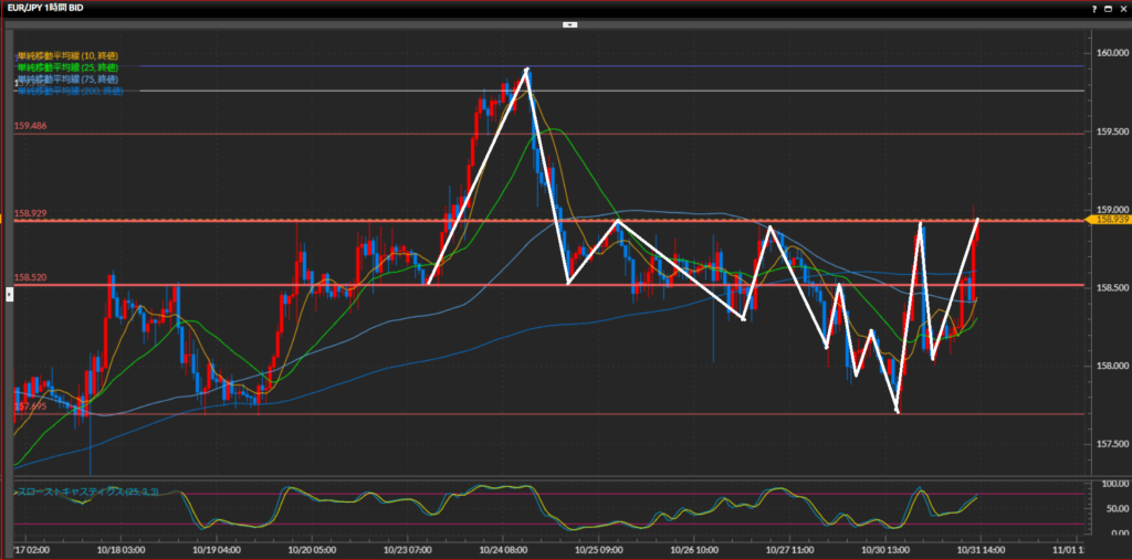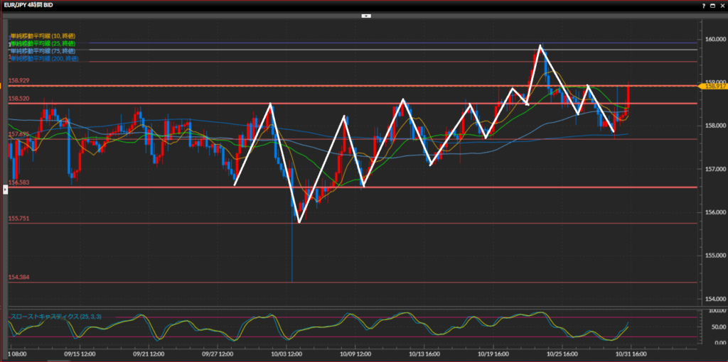 - ユーロ円は日足は上目線、4時間足と1時間足は水平線158.93円を実体で上抜けたら上目線に転換。