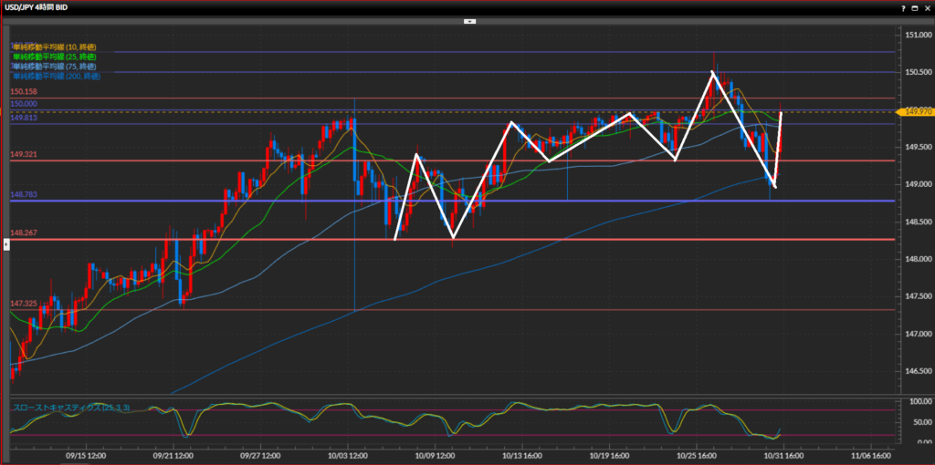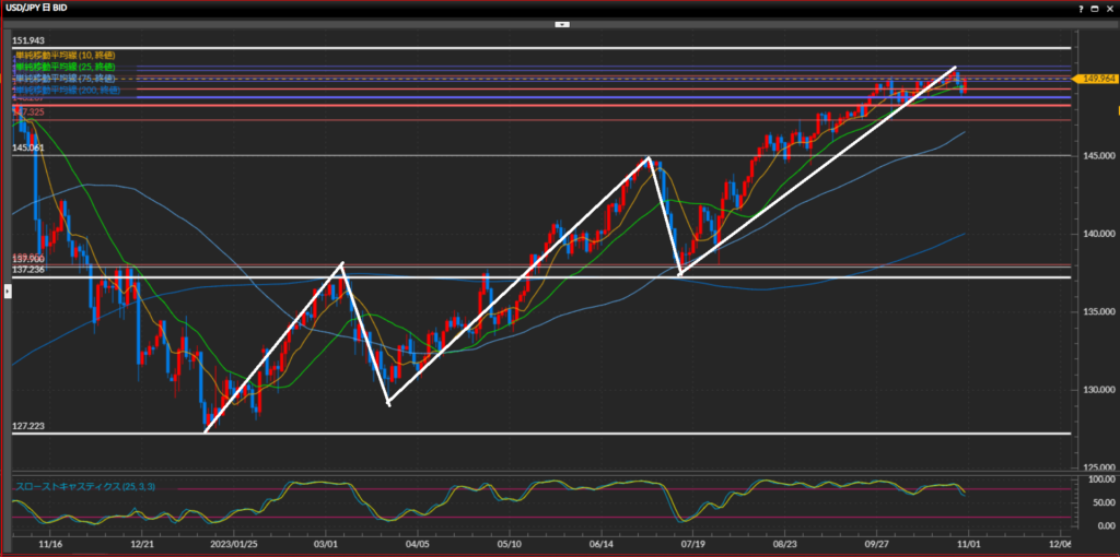 直近の波の高値で引いた水平線149.81円を上抜けたため下目線が終了。波が安値を切り上げたら上目線。10SMAと25SMAがゴールデンクロスしており上昇が強い。