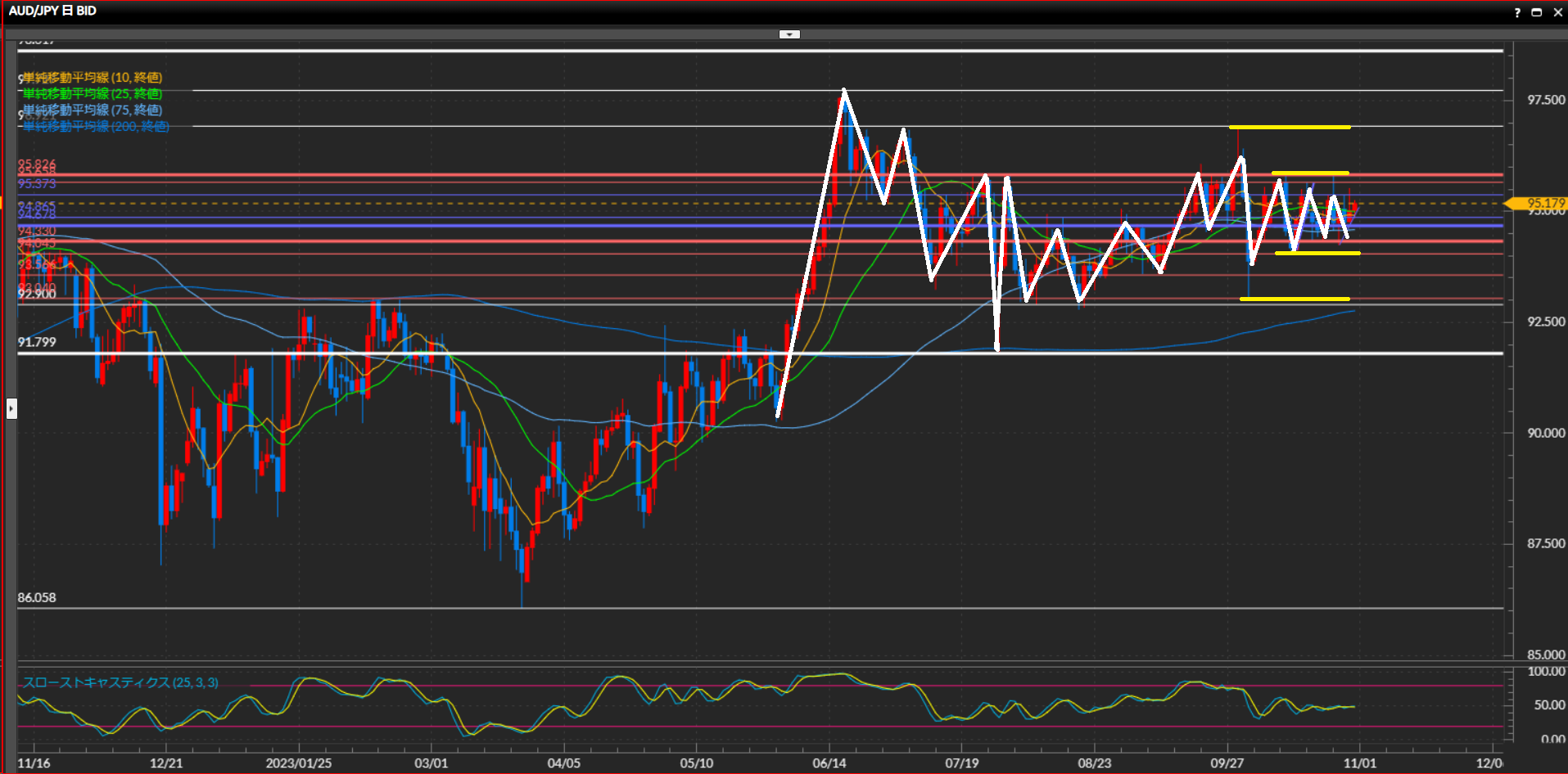 - 豪ドル円は日足では上目線継続、4時間足はレンジ、1時間足では上昇トレンド。比較的波の形がはっきりしていて、ダウの基本通りに狙いやすい。レンジの中のトレンド方向に沿って仕掛けていく。