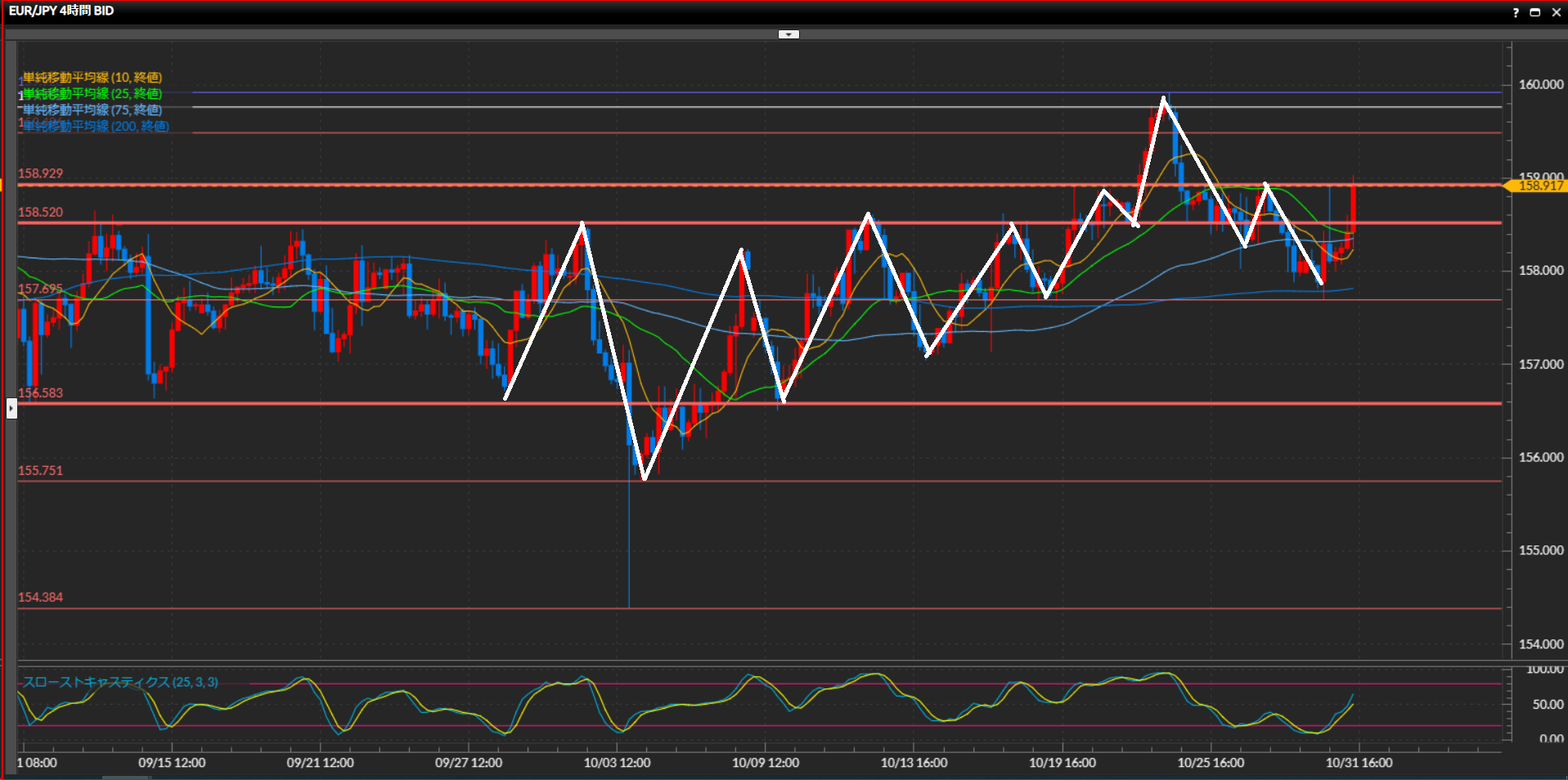 上目線。10月初にレンジの下値で引いた水平線156.58円を下抜け確定したものの、現在はここが押し目となり高値を目指している。最高値159.76円の上抜けチャレンジ中。目線を分ける水平線は151.41円。