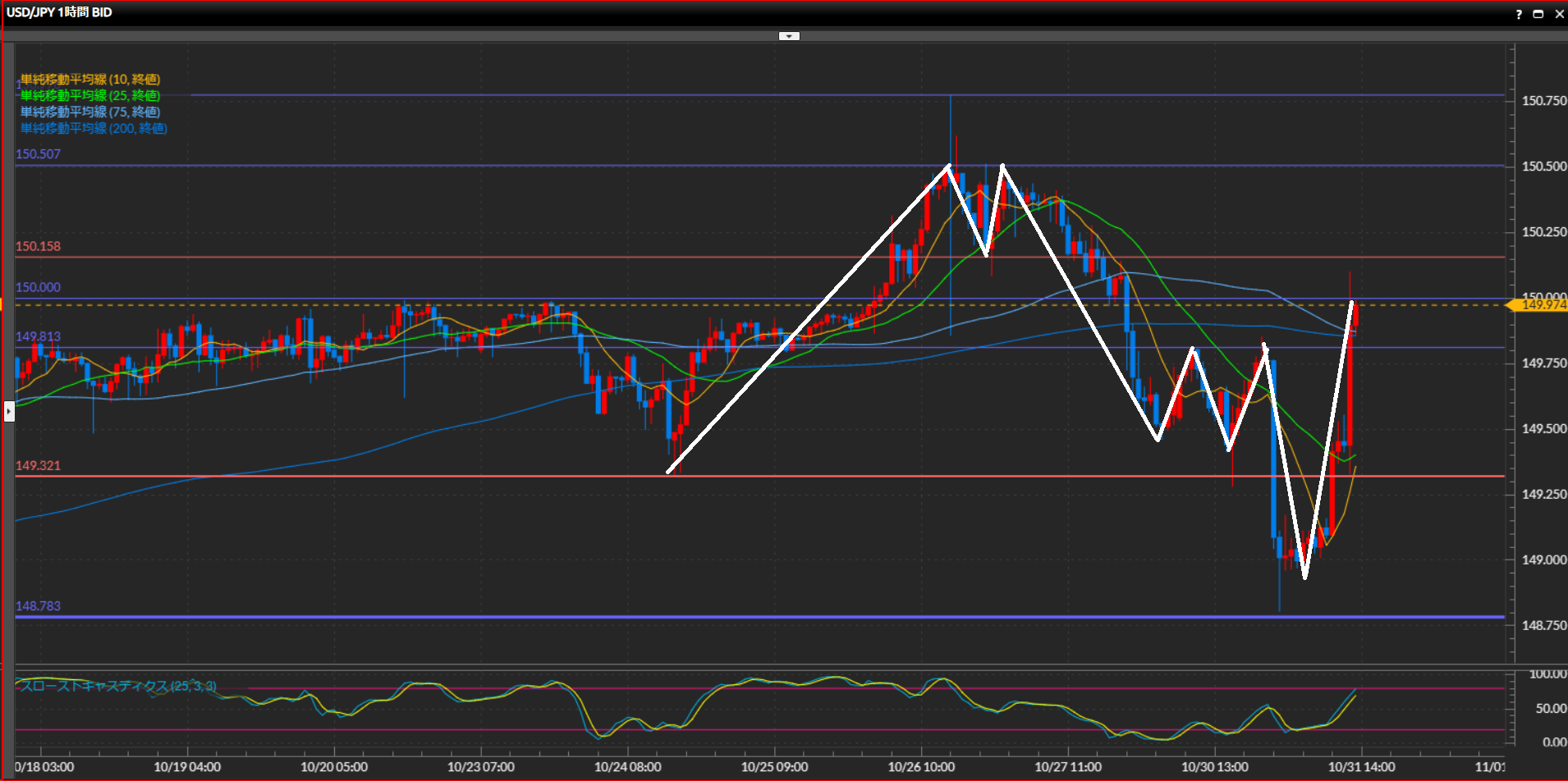 直近の波の高値で引いた水平線149.81円を上抜けたため下目線が終了。波が安値を切り上げたら上目線。10SMAと25SMAがゴールデンクロスしており上昇が強い。