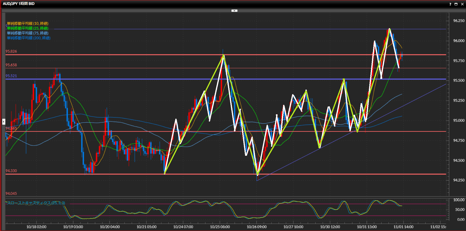 小さな波(白色)では直近高値を切上げ下目線が終了しているものの、大きな波(緑色)では波の高値を超えていないため、下目線が継続。波の捉え方で目線がバラバラになる時は、その時間足を基準にしたトレードは様子見。