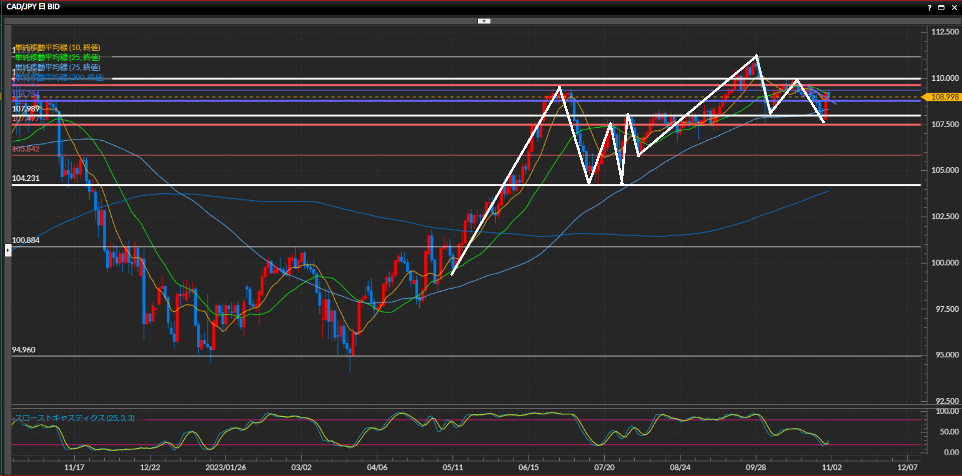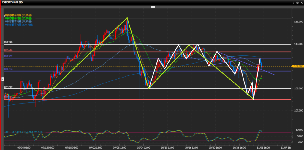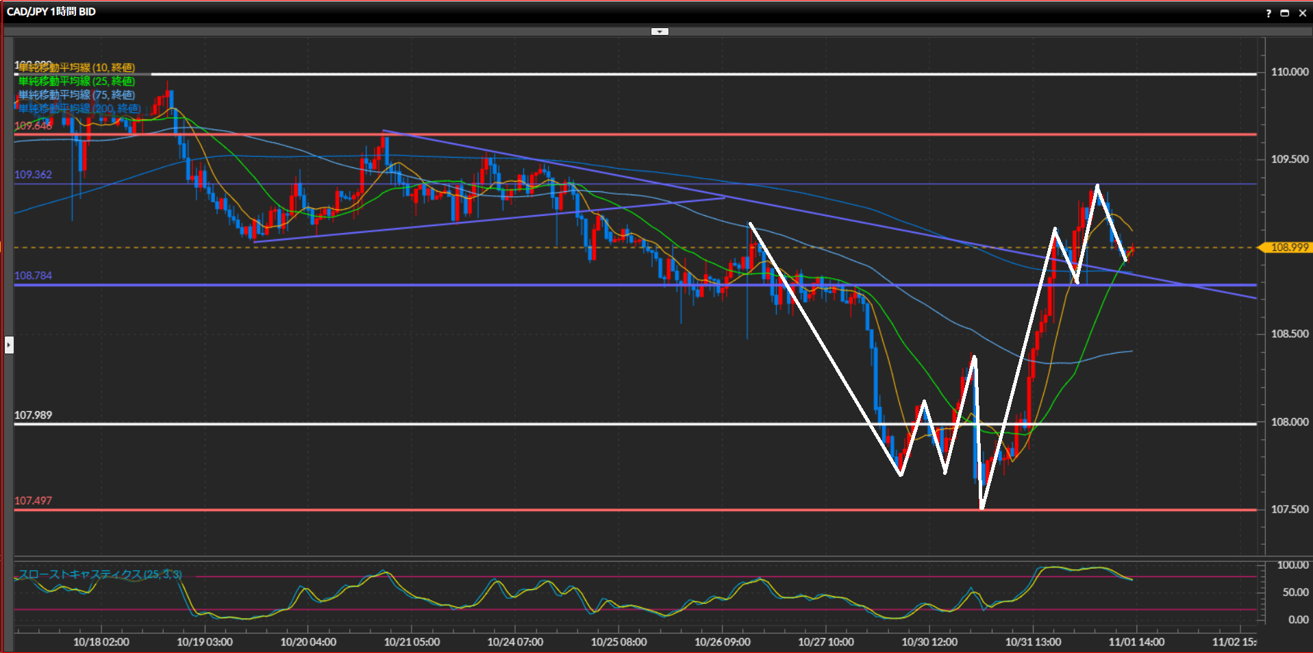 - 加ドル円は日足は下目線、4時間足は微妙、1時間足は上目線といった所。1時間足では108.78円に目線の転換線を引いているが、信頼度は低め。上位足含めて方向性がはっきりするまでは様子を見たい。