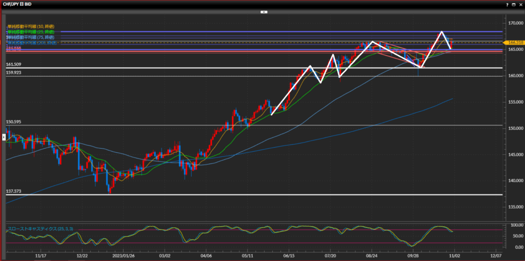 上昇トレンド。フラン円は手元でデータを遡れる1970年1月以降で最高値を更新しており、上値を抑えそうな水平線が存在しない。ファンダ的には中東情勢が緊迫化すれば安全資産とされるスイスフランが変われる傾向にあり、ヘッドラインに注意。昨日は日銀政策発表により陽線で確定したが、10SMAは越えられていない。