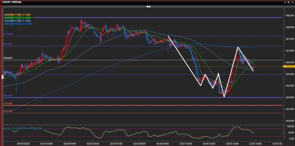 直近安値で引いた水平線165.99円を上抜け確定した事で下目線が終了、安値切上げを確認出来たら上目線で固定。165.99円あたりでレジサポ転換して上昇を始めたらロングの狙い目。