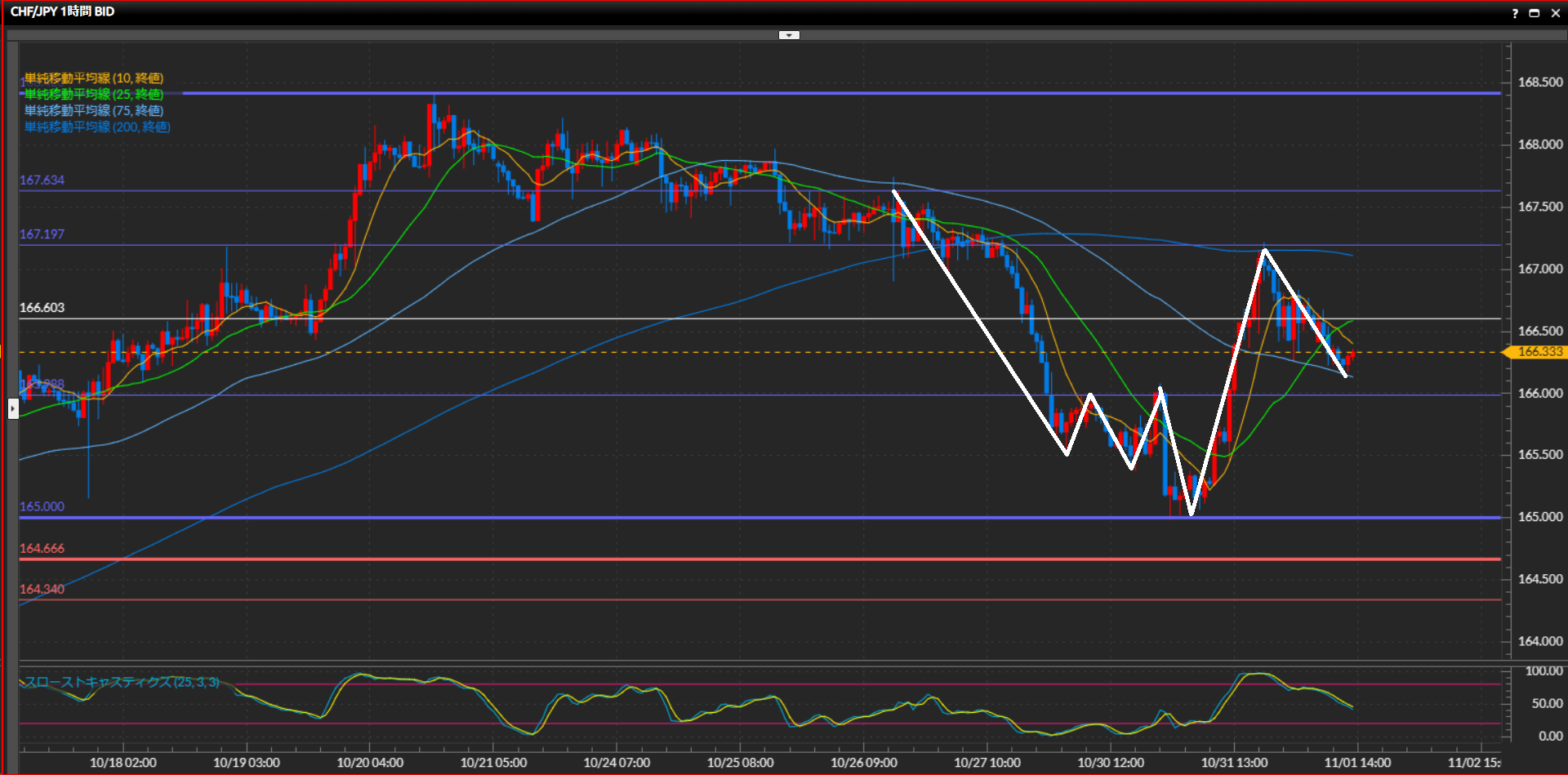 - フラン円は日足〜4時間足は上目線継続、1時間足は下目線が終了。1時間足が上目線に転換したらロング狙い。フラン円は日銀政策だけでなく中東情勢にも強く影響を受けるので、引き続きヘッドラインに注意。