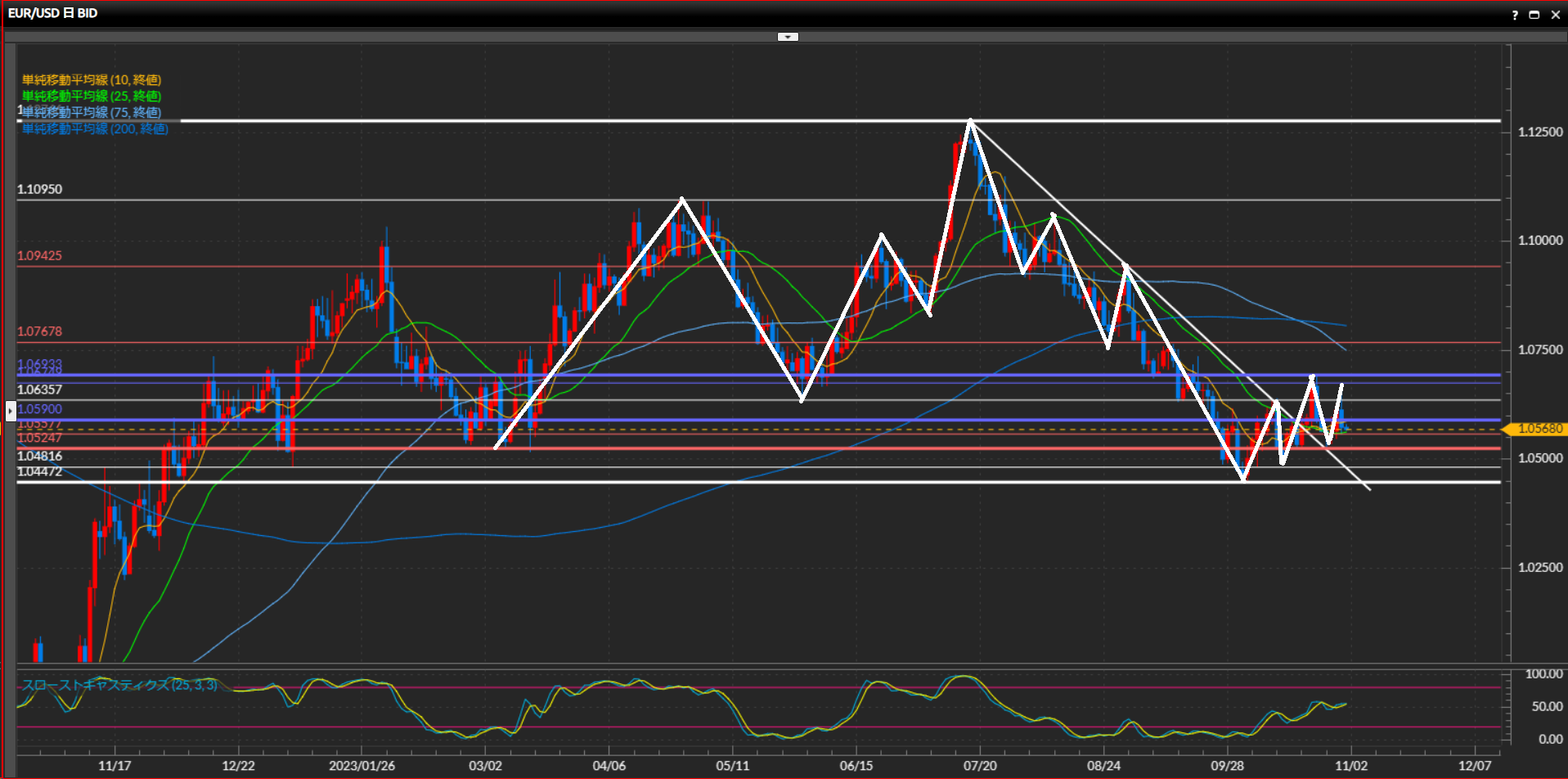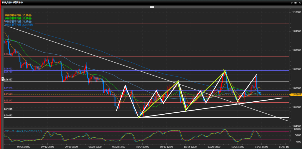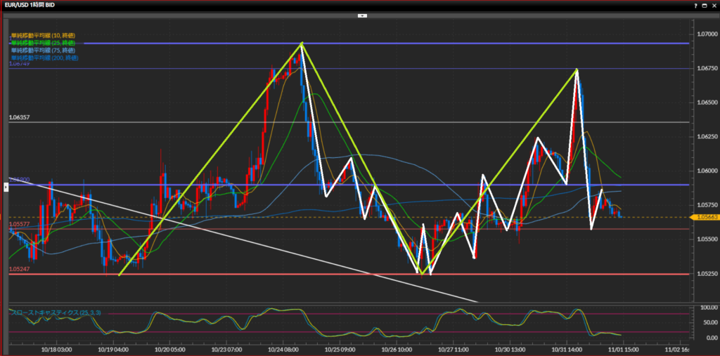大きな波(緑色)では緩やかに安値を切り上げているため上目線と捉えるが、直近の小さな波(白色)は高値を更新出来ないまま下落している。直近安値は1.0525ドルで、抜けたら高値安値切り下げの下目線に転換。