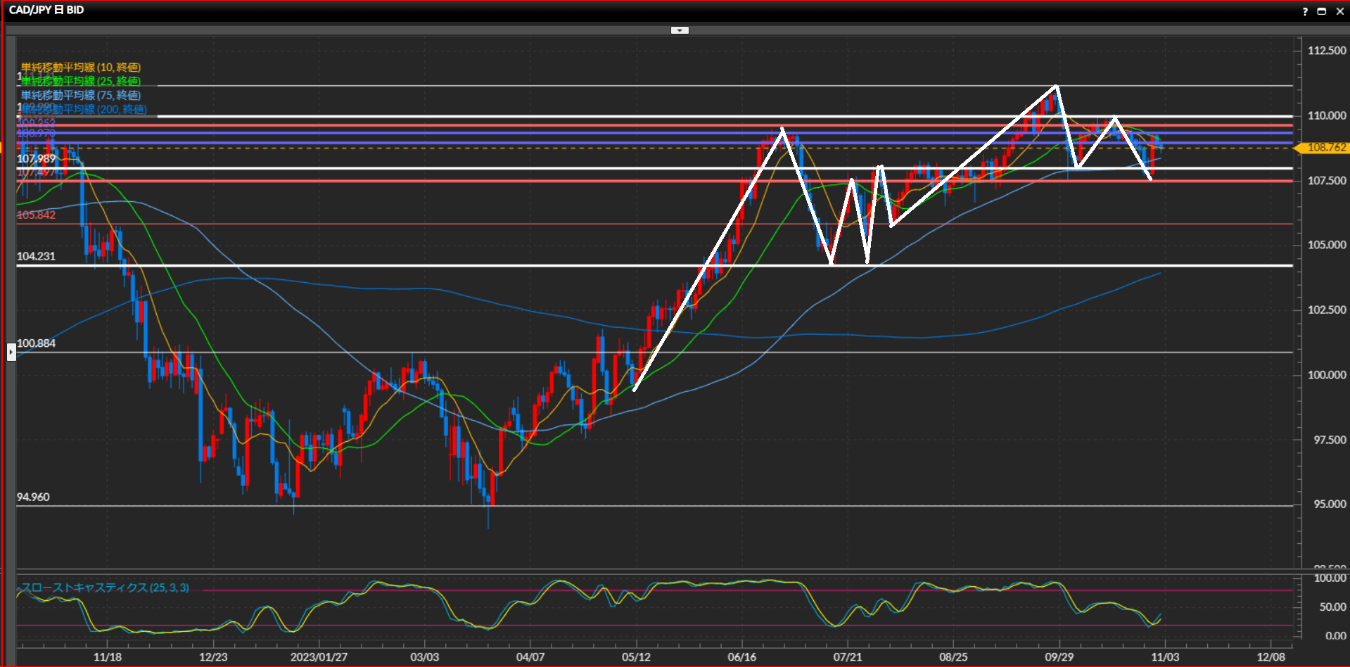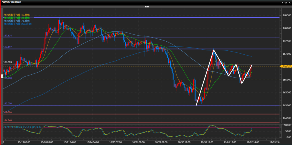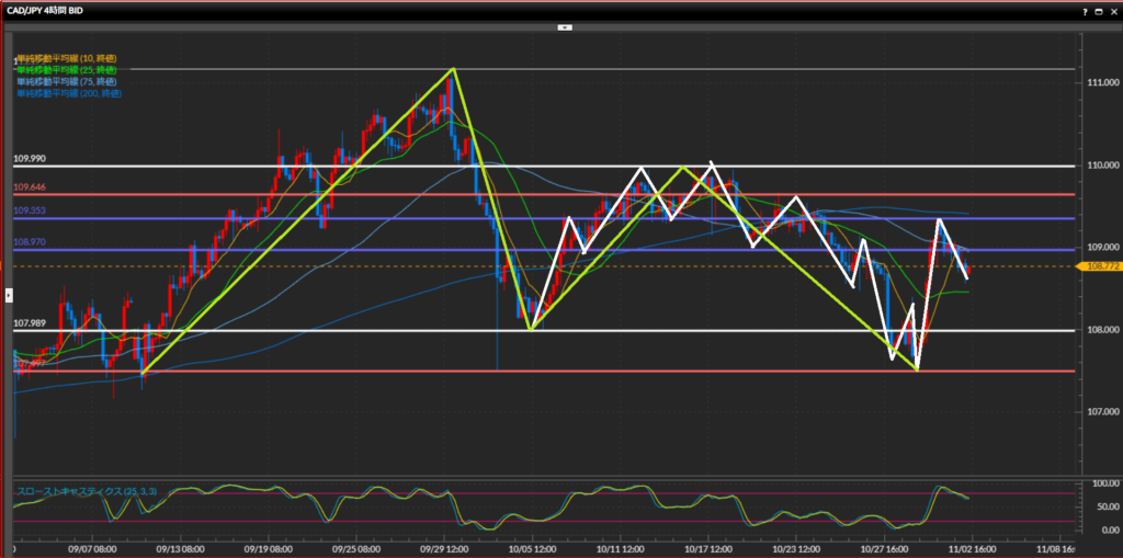 - 加ドル円は日足は下目線、4時間足は捉える波の大きさによって曖昧なので保留、1時間足は下目線。基本的には1時間足を基準としてショートを狙う。