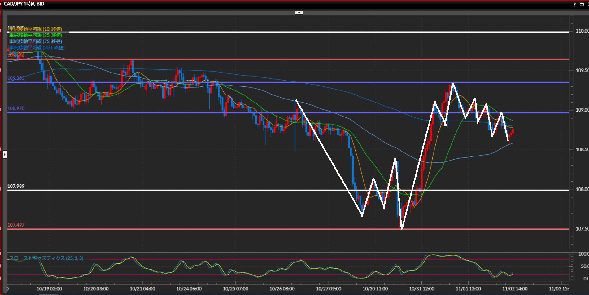 小さな波の安値107.99円を下抜け確定したため、ダウでは下目線に転換。しかし日足水平線の下の4時間足水平線107.50円でサポートされ10SMAの上側で確定している事を踏まえると、日足基準のショート狙いは難しい。
