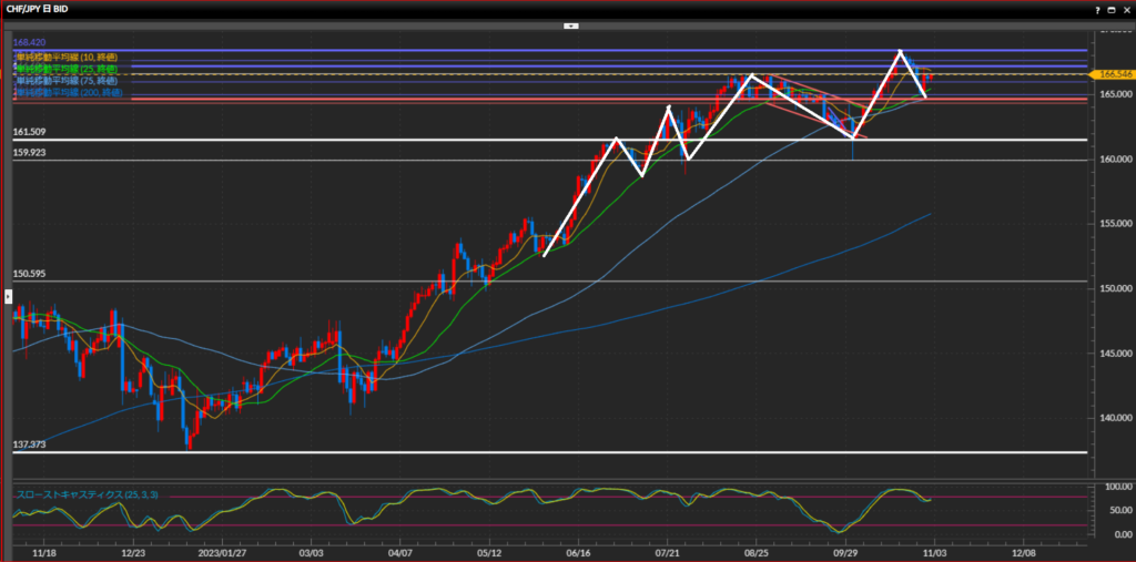 - フラン円は日足は上目線、4時間足〜1時間足は下目線。4時間足の10SMAが直角に折れ曲がっているのが警戒ポイント。フラン円は日銀政策だけでなく中東情勢にも強く影響を受けるので、引き続きヘッドラインに注意。